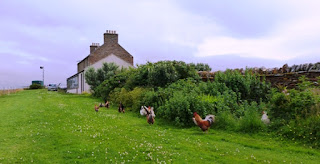 Their henny hoose is at the end here. The building belongs to a neighbour but he did it up for me and lets me keep my hens here. He wasn't impressed when I'd shown him pictures of fancy wooden "arks" for poultry, fearing they would be blown Westwards in the first gale! He was probably right as that happened (sadly) during the hurricane force winds in the 1950s which decimated the poultry industry in Orkney.