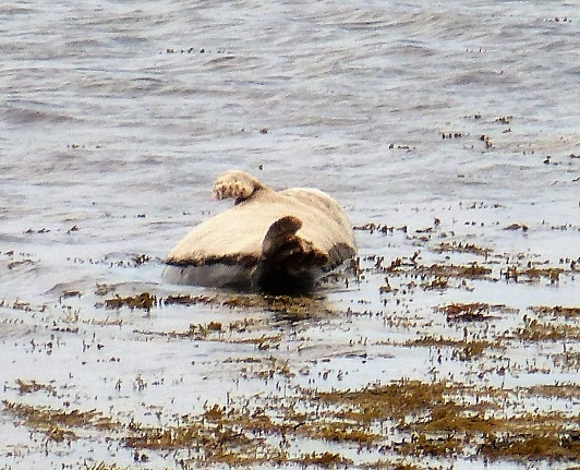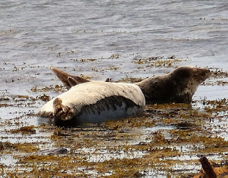 Above are two grey seals down at the shore. They were completely unconcerned that I was nearby today. Though I was using a zoom lens to take their pictures. One is shedding is a pup shedding its fluffy coat. It looks as though it has just unzipped its cardigan! Or maybe he is a real selkie.